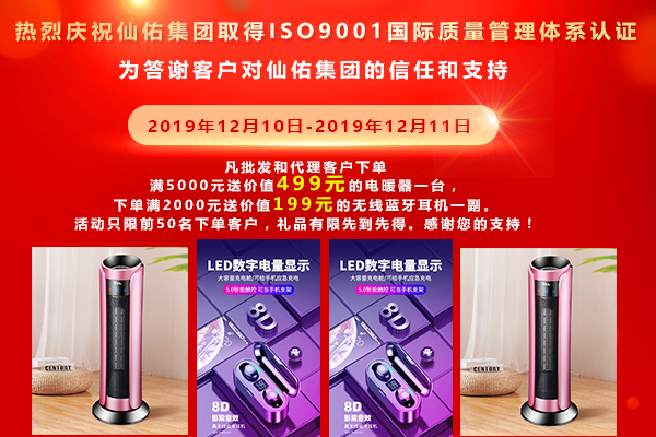 2019年12月10日-2019年12月11日,凡批發和代理客戶下單,滿5000元送價值499元的電暖氣一臺,下單滿2000元送價值199元的無線藍牙耳機一副?;顒又幌耷?0名下單客戶,禮品有限先到先得,感謝您的支持!